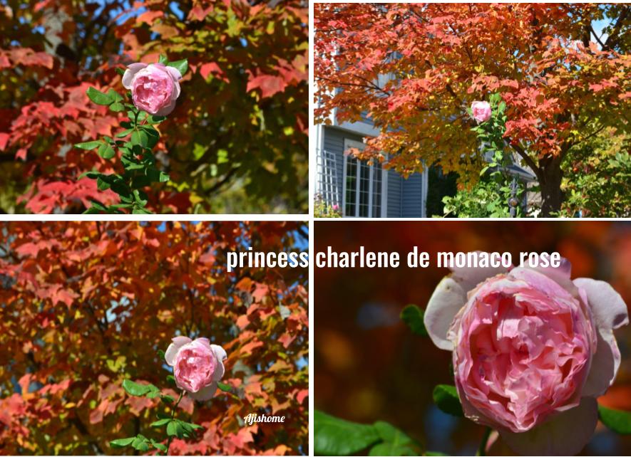 We are wrapping up our garden for the season, but still, most of our roses are blooming beautifully. One of my favorites, the Princess Charlene de Monaco rose, has been blooming since July. Remarkably, within just three months, it has grown more than five feet tall, reaching toward the maple tree. Now in the fall season, the sight of its vibrant petals against the fall color backdrop is simply stunning; here is the link to how it looks when bought, and here is the link to the first flowers.