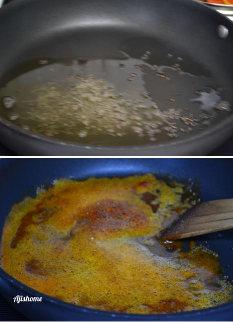 - Heat sesame oil in the pan until it shimmers, then add mustard seeds and listen for them to pop. Quickly add fenugreek seeds to enhance the flavor.